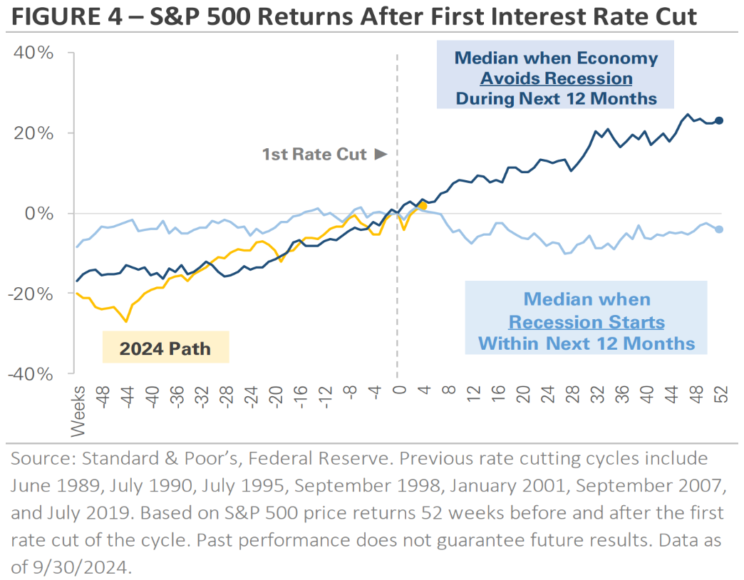 The next chart demonstrates why the economy’s direction is important. Figure 4 tracks the S&P 500’s performance in the 12 months before and after the first interest rate cut. It features two paths. The dark blue line represents the S&P 500’s median return path when the economy avoids a recession in the 12 months following the first rate cut. The light blue line represents the S&P 500’s median return path when the economy enters a recession within 12 months after the first rate cut. For comparison, the two lines are indexed to 100 the week of the Fed’s first interest rate cut.