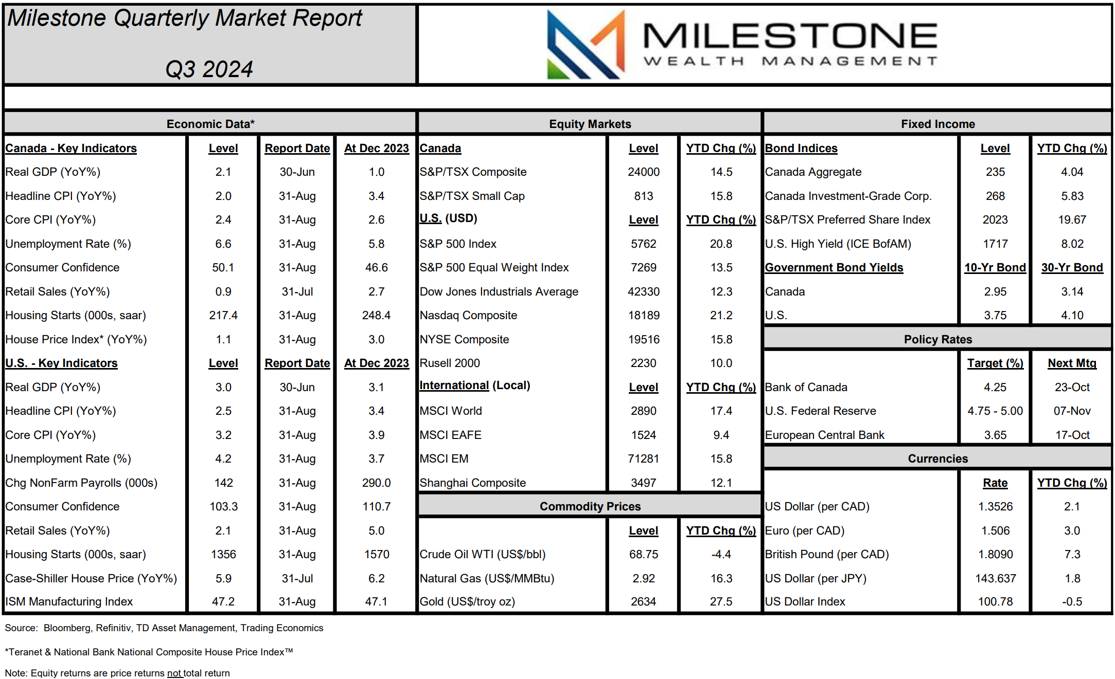 Here is our Milestone Quarterly Market Report on economic data, capital markets, commodities, and currencies through September 30th, 2024: