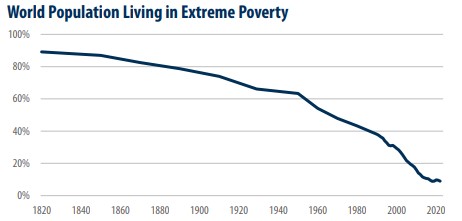 While daily news often focuses on immediate problems, these long-term trends tell a powerful story of human progress. Life expectancy has more than doubled, extreme poverty has plummeted, and literacy rates have soared. In addition, as a side note and contrary to what the media projects, violent crime rates in the U.S. have dropped almost 50% from 1992 to 2022.