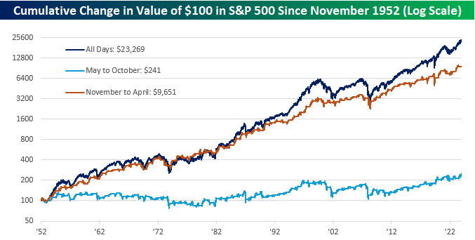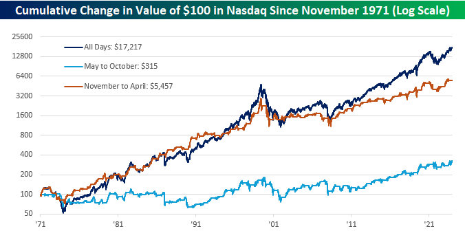 - For the S&P 500 (since 1952) and the Nasdaq Composite (since 1971), the majority of returns have occurred during the November through April period, as shown by the charts below.