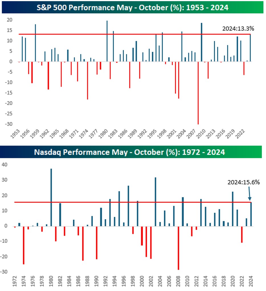 - The S&P 500 surged 13.3% from May through October, its best performance for this period since 2009.
