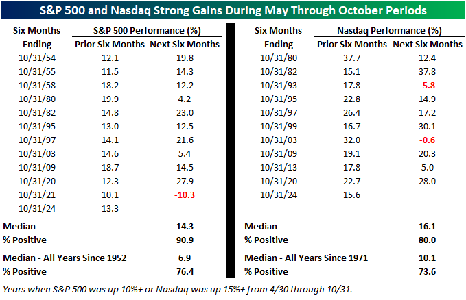 - For the Nasdaq, when it rallied 15%+ during the May-October period, the subsequent six months yielded a median gain of 16.1%, with positive returns 80% of the time compared to median gains for all years at 10.1% with positive returns just 73.6% of the time.