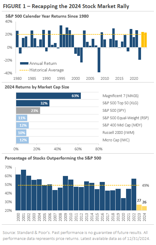 The past two years have been remarkable for investors, with the S&P 500 delivering strong returns in back-to-back years. The three charts in Figure 1 (next page) take a closer look at the U.S. stock market’s rally in 2024, a year in which the S&P 500 set more than 55 new all-time highs. The top chart, which graphs the S&P 500’s price return for each calendar year since 1980, shows the index posted gains of over +20% in 2023 and 2024. It marked the first time since the 4-year stretch from 1995 to 1998, and like the late 1990s, large-cap technology stocks played a major role in the S&P 500’s gains. For the S&P/TSX Composite, its price return for 2024 was just under that mark (+18%), but on a total return basis it was over 20%. However, as opposed to the S&P 500, last year’s return was only in the low double digits.