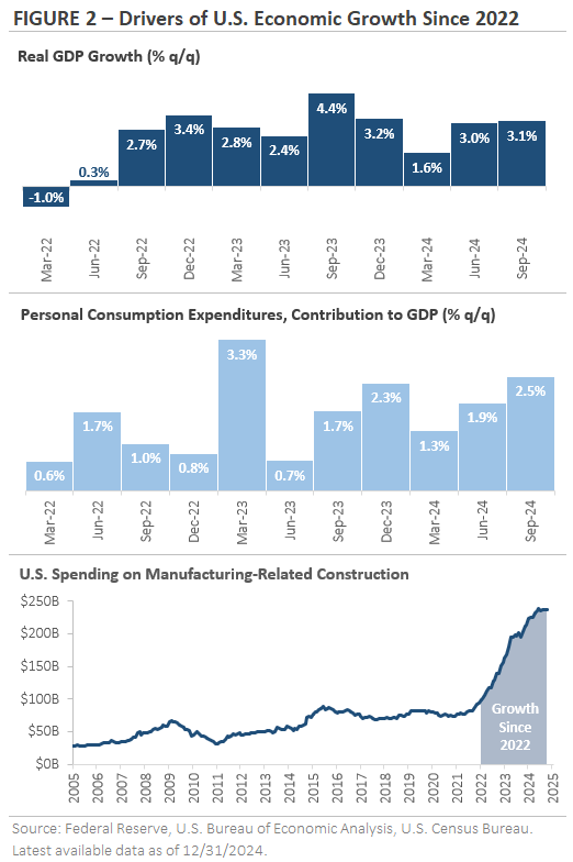 The U.S. economy has consistently defied expectations of a slowdown since the Fed started raising interest rates in March 2022. Economists and market participants initially expected growth to slow as the Fed raised interest rates. However, it has now been nearly three years since the Fed’s first rate hike, and the economy continues to grow at an above-trend rate. While higher rates have slowed housing demand and weighed on business investment, the U.S. economy has managed to defy expectations with solid GDP growth. The top chart in Figure 2 shows the U.S. economy grew at a +3.1% annualized pace in 3Q24, marking the third quarter in the past four with growth above +3%.