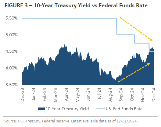 Recent economic strength has also led the market to re-evaluate its rate cut forecast. This dynamic can be seen in the bond market, where longer-maturity Treasury yields have risen sharply since the first rate cut in September. Figure 3 graphs the 10-year Treasury yield against the federal funds rate, which is the interest rate the Fed adjusts to set monetary policy. Since the first rate cut in September, the federal funds rate has decreased by -1.00%. Of interest, by comparison, in Canada the key target rate has now fallen -1.75%, indicative of a weaker economy here and this has put pressure on the Loonie which fell 8% in 2024 relative to the U.S. dollar.
