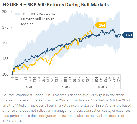 Figure 4 above tracks the current bull market, which started in October 2022 and is now in its third year. The current bull market has performed in line with historical norms, but the chart shows that returns often moderate as bull markets mature. This suggests that the market’s focus could shift to fundamentals and earnings as the next catalyst to push markets higher. 2025 is shaping up to be a year where companies will need to deliver on investors’ expectations to justify their high valuations.