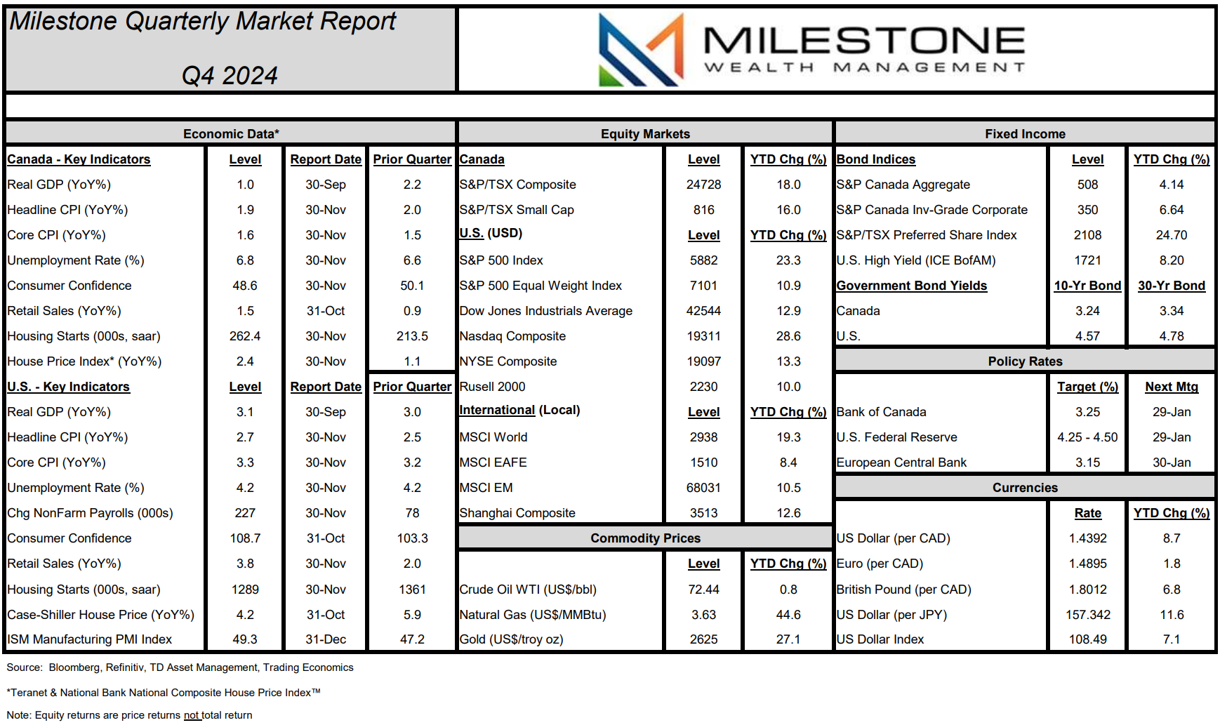 Here is our Milestone Quarterly Market Report on economic data, capital markets, commodities, and currencies through December 31st, 2024: (click here for PDF version)