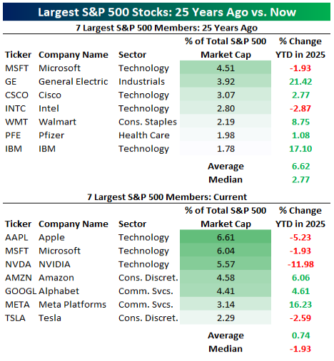 As the next two tables show, while these current seven giants hold a larger share (32%) of the S&P 500's market capitalization than their predecessors did (20%), their performance has been weaker this year, with some, including NVIDIA, experiencing losses. Essentially, older, once-dominant companies are currently showing stronger growth than today's market behemoths.