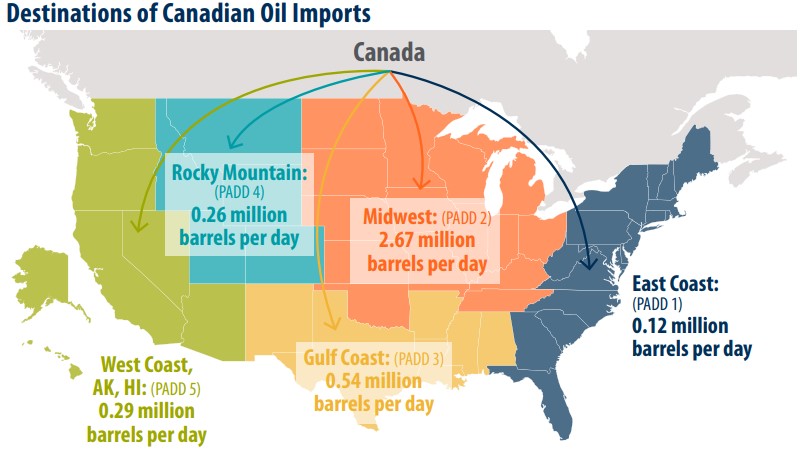In 2023, the U.S. imported 8.51 million barrels per day (mb/d) of petroleum from 86 countries, with Canada accounting for a staggering 52% (4.42 mb/d), as shown in the first chart below. To put this into perspective, Mexico—the second-largest supplier—provided just 11% (0.91 mb/d). This reliance is further reinforced by geographic proximity and an extensive network of pipelines and rail systems that efficiently transport Canadian crude to U.S. refineries, particularly in inland regions like the Midwest and Rocky Mountains, as shown in the second chart below.