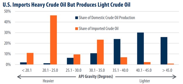 One of the key reasons for this reliance lies in the type of crude oil each country produces. U.S. refineries are designed to process heavy crude oil, a resource Canada supplies in abundance, primarily from Alberta's oil sands. In contrast, the U.S. shale boom has produced light sweet crude oil, which many domestic refineries are not equipped to handle without costly upgrades. In 2023 alone, Canada supplied 24% of U.S. refinery throughput. The chart below, shows the share of imported crude oil vs domestic crude oil production by weight.