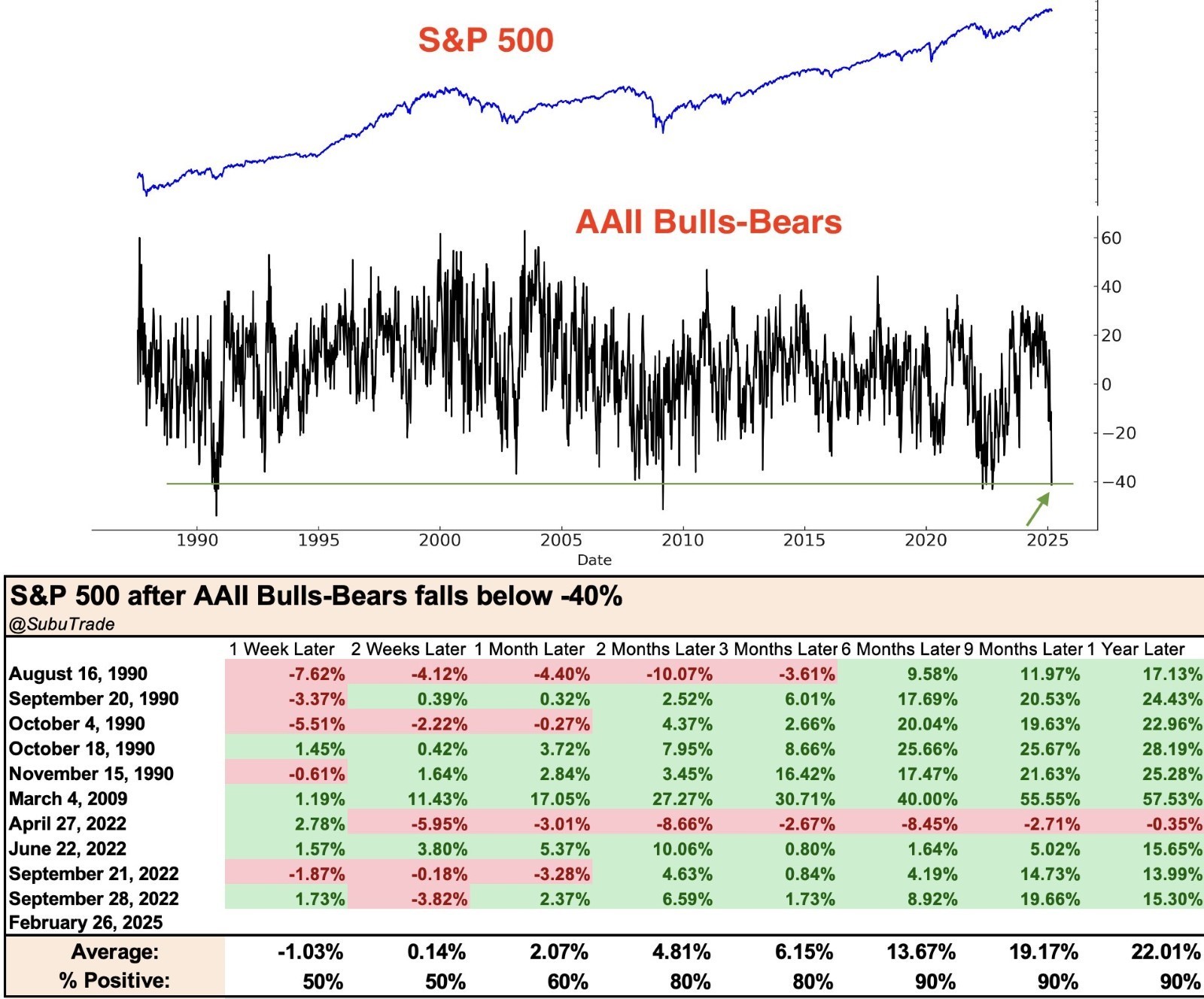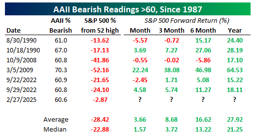 The widely followed American Association of Individual Investors (AAII) Sentiment Survey recently reported a significant surge in bearish (negative) sentiment, with 60.6% of respondents expressing a negative outlook. This level of bearishness is exceptionally high. Historically, such extreme bearish sentiment has been rare, with only six prior events of bearish sentiment of 60% or more, typically coinciding with major bear market lows, as shown in the charts below. These signals are important for contrarian investors because if everyone is bearish, there's less supply to sell, and the market often starts to rally (or vice-versa for bullish results). Without knowing any context, a surge in bearishness should, in theory, lead to positive market returns.