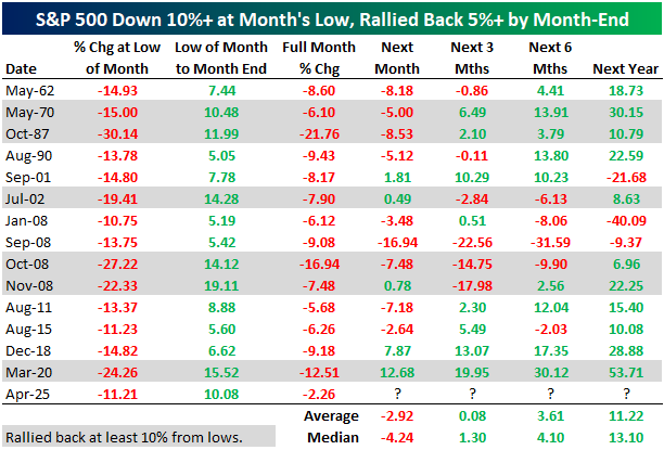 Looking at historical precedents, the data above shows that when the S&P 500 has managed a 10%+ rally from its intra-month lows (after being down 10%+), the following year has typically seen strong gains. In all six previous occurrences where the index rallied back at least 10% by month-end (indicated by years highlighted in grey), the S&P 500 was higher one year later with an average gain of 22%. However, the shorter-term outlook was less consistent, with the average return in the next month being negative and only modest gains over the following three and six months. This pattern suggests that while sharp rebounds from deep declines can set the stage for longer-term strength, the immediate aftermath often remains volatile and uncertain.