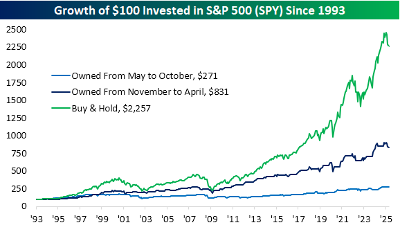 As investors look ahead to May, the old seasonal adage "sell in May and go away" gains some relevance. Historical data indicates that S&P 500 returns from May through October have been weaker than those from November through April. For example, $100 invested in the S&P 500 ETF (SPY) only during the May-October period since 1993 would now be worth $271, compared to $831 if invested only from November to April, as shown in the first chart below. Nevertheless, a buy-and-hold strategy would have yielded over $2,200 (2.65X higher than avoiding May-Oct), underscoring the benefits of long-term investing despite seasonal weakness, as shown in the second chart below. However, April has historically been the best month of the year but that didn’t pan out this year, so historical patterns and monthly seasonality are only helpful to some degree.